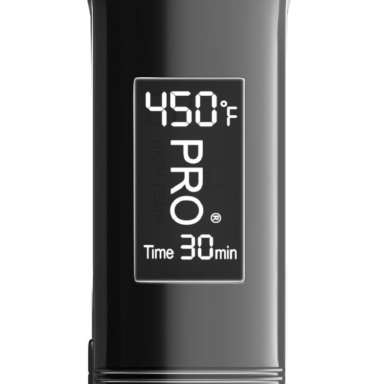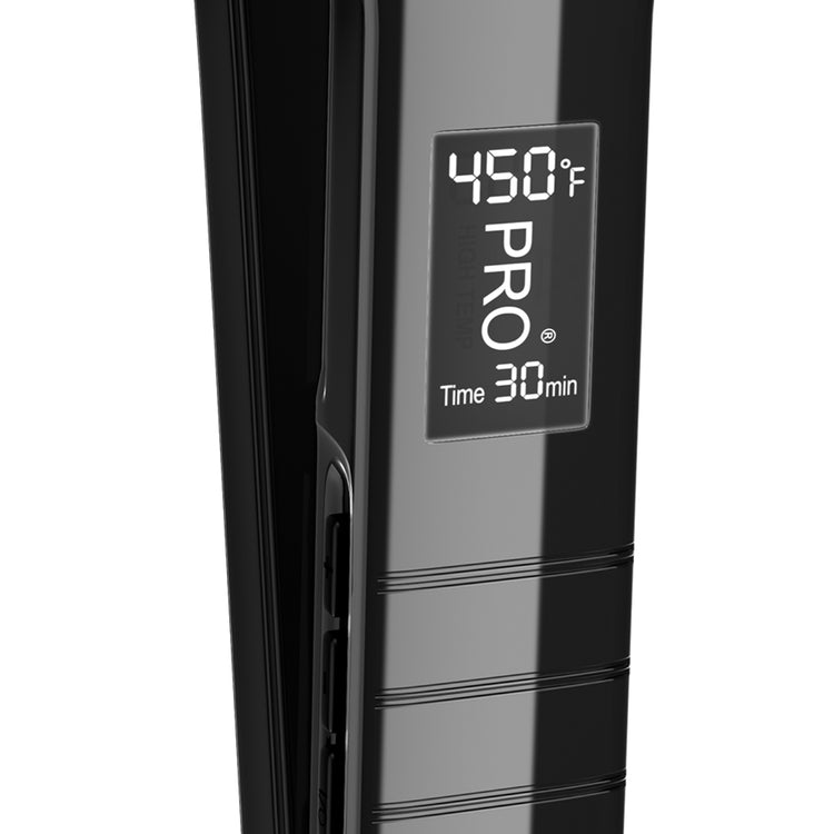 This professional flat iron is fully adjustable up to 450°F and goes to 400°F in under one minute. Precision-smart LCD screen turns white when set temperature is reached and also displays temperature control and auto shut-off feature.